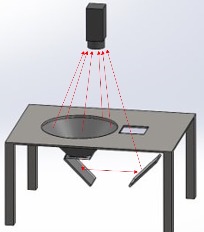 The bottom surface of the bowl is glass. There are two mirrors under the glass, the mirror can reflect the barcode at the bottom surface of the product to the camera at the top.